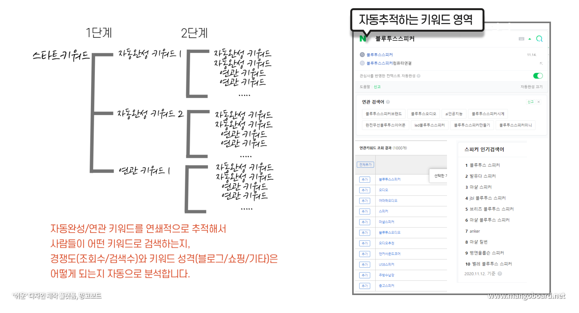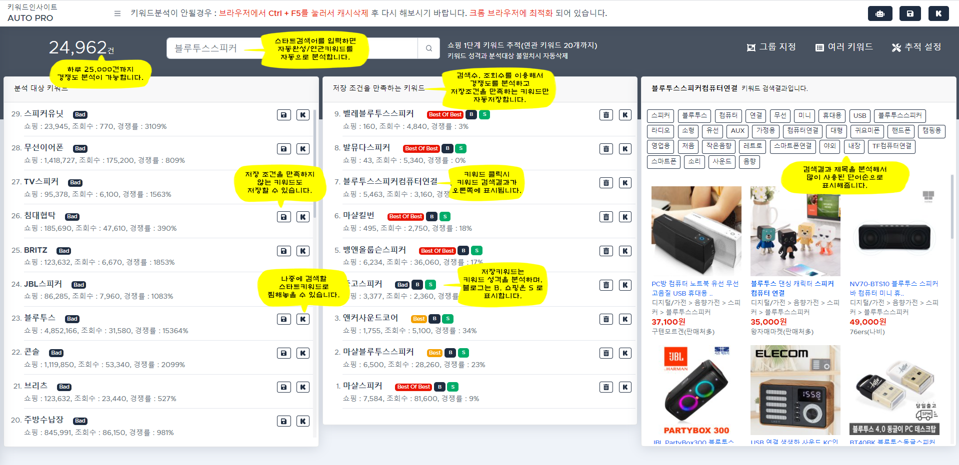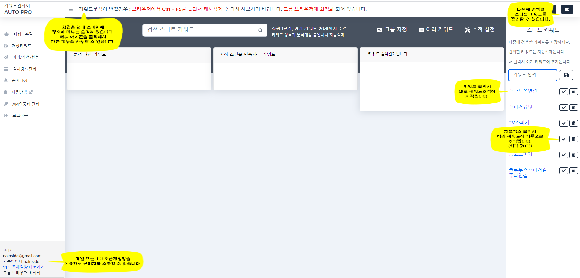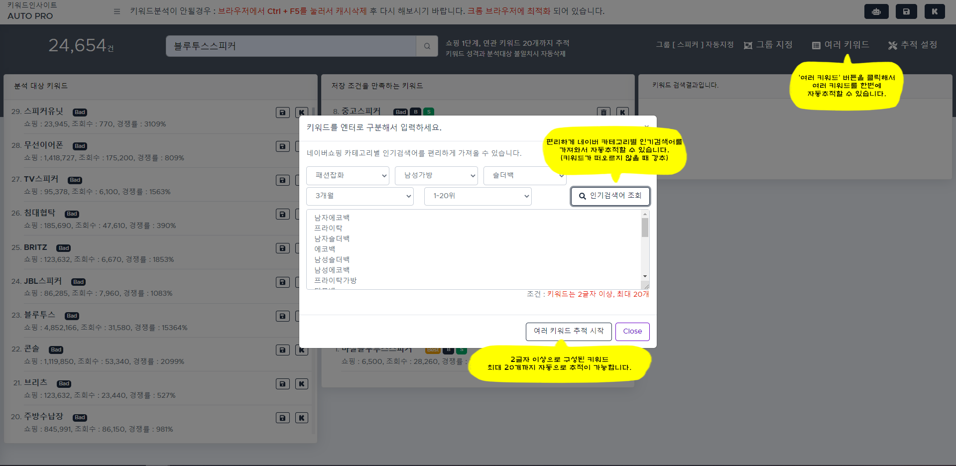 한번에 여러 키워드(최대 20개)를 입력하면 순차적으로 자동추적 합니다.
