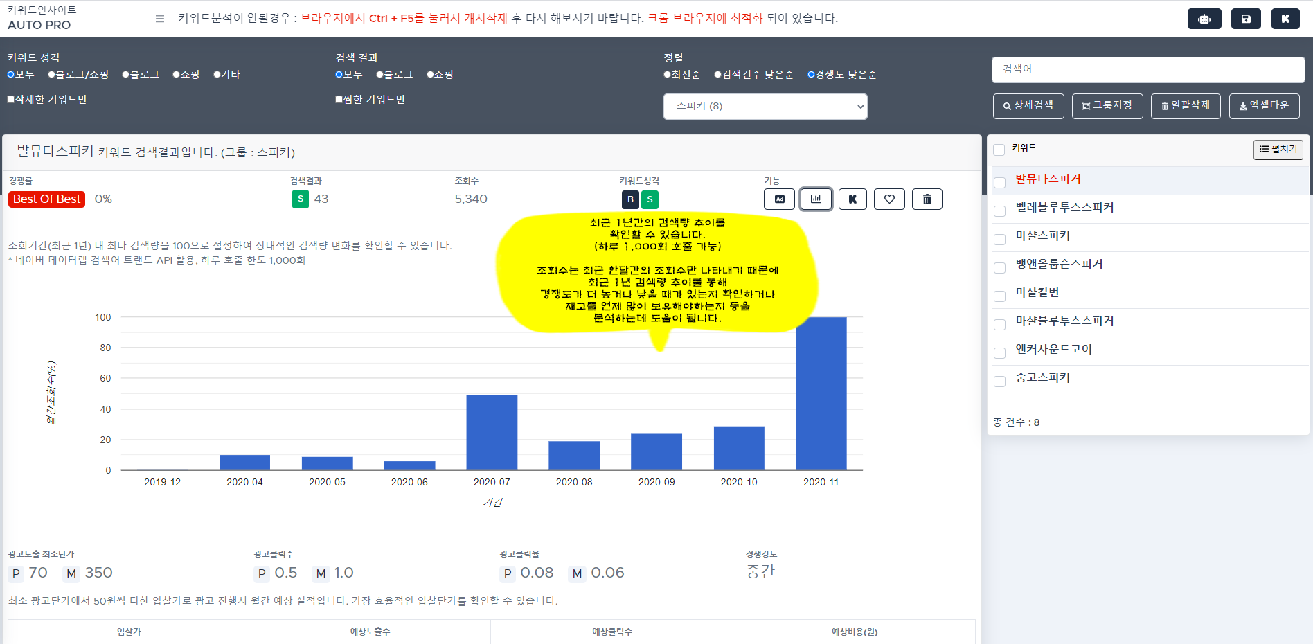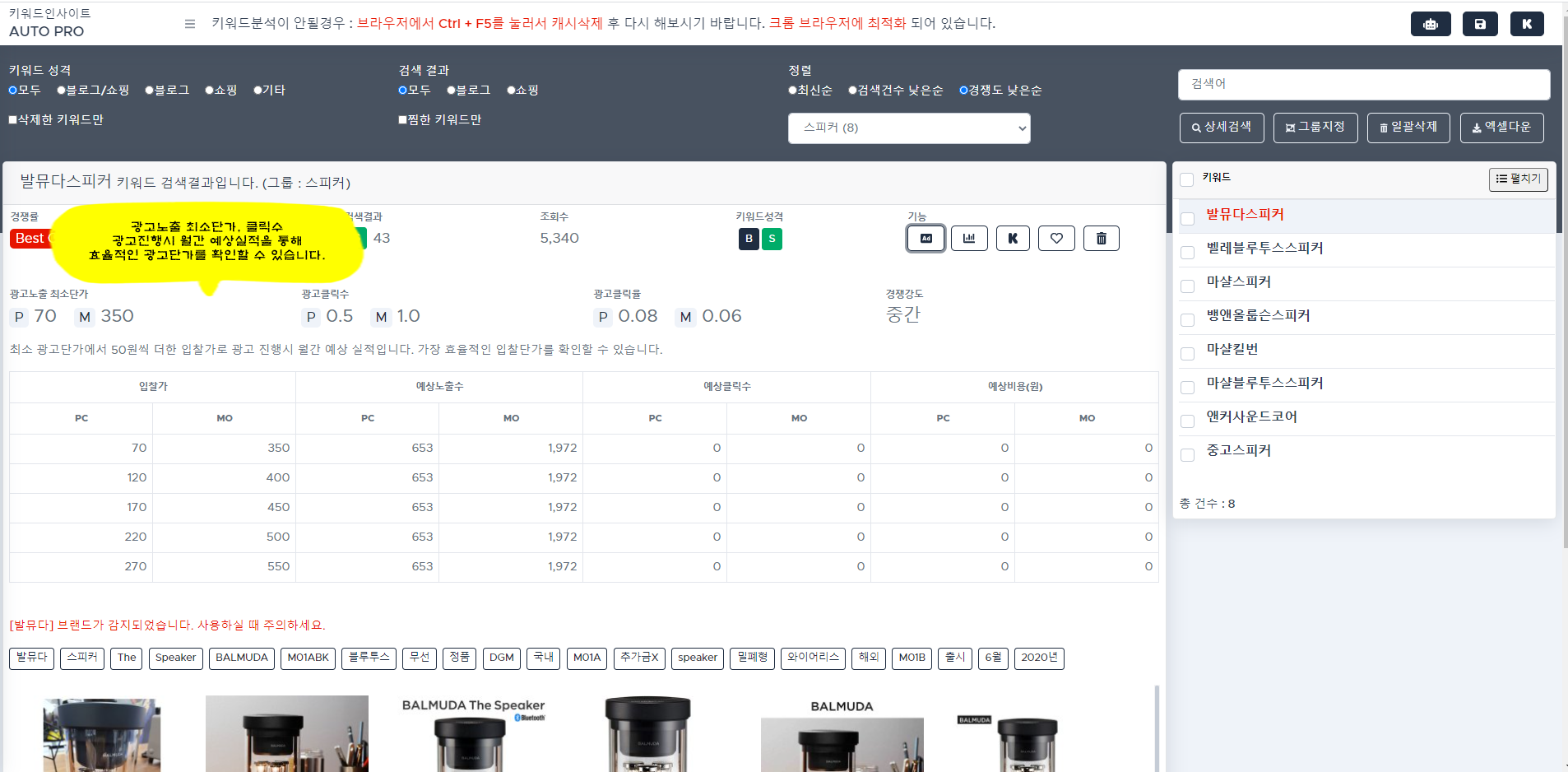 광고노출 최소단가, 클릭수, 월간예상실적 등을 통해 효율적인 광고단가를 확인할 수 있습니다.