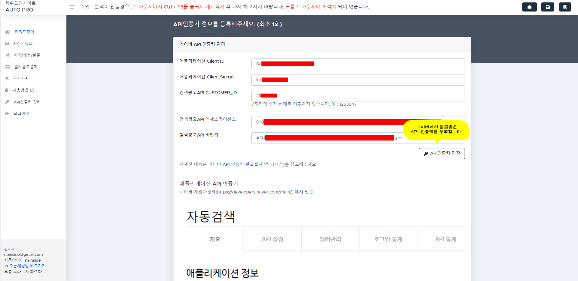 네이버 개발자센터, 네이버 검색광고에서 발급받은 인증키를 등록합니다.