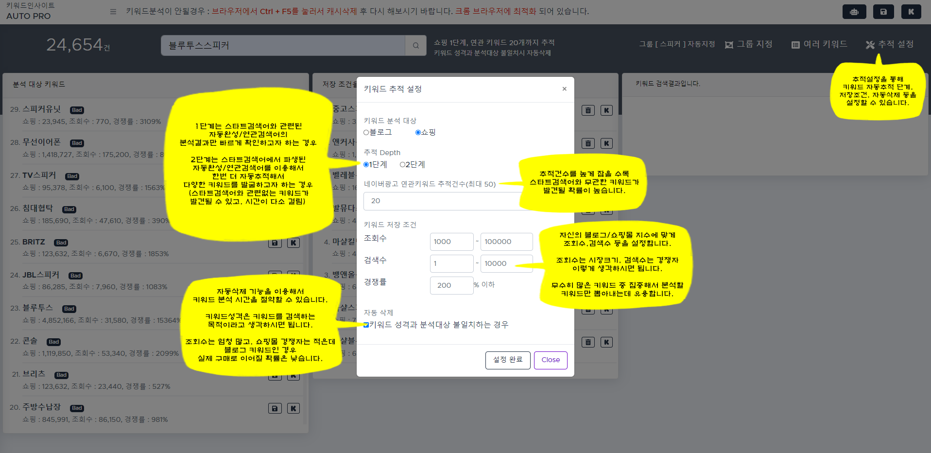 키워드 자동추적 단계, 저장조건, 자동삭제 등을 설정할 수 있습니다.